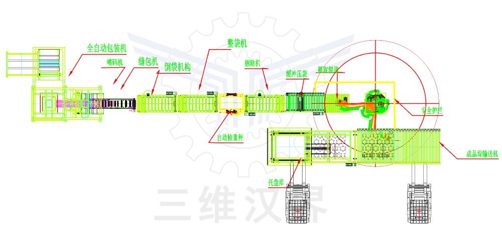 硫銨從烘干床下料口落入輸送帶輸送到包裝機(jī)料倉(cāng),自動(dòng)下料、稱重、取袋套袋、裝料、縫包后,整形并輸送給碼垛機(jī)器人,機(jī)器人碼垛、托盤庫(kù)自動(dòng)供給空托盤、滿垛輸送機(jī)輸送、托盤全自動(dòng)裝車機(jī)裝車或轉(zhuǎn)運(yùn)到倉(cāng)庫(kù)既定位置整齊擺放。